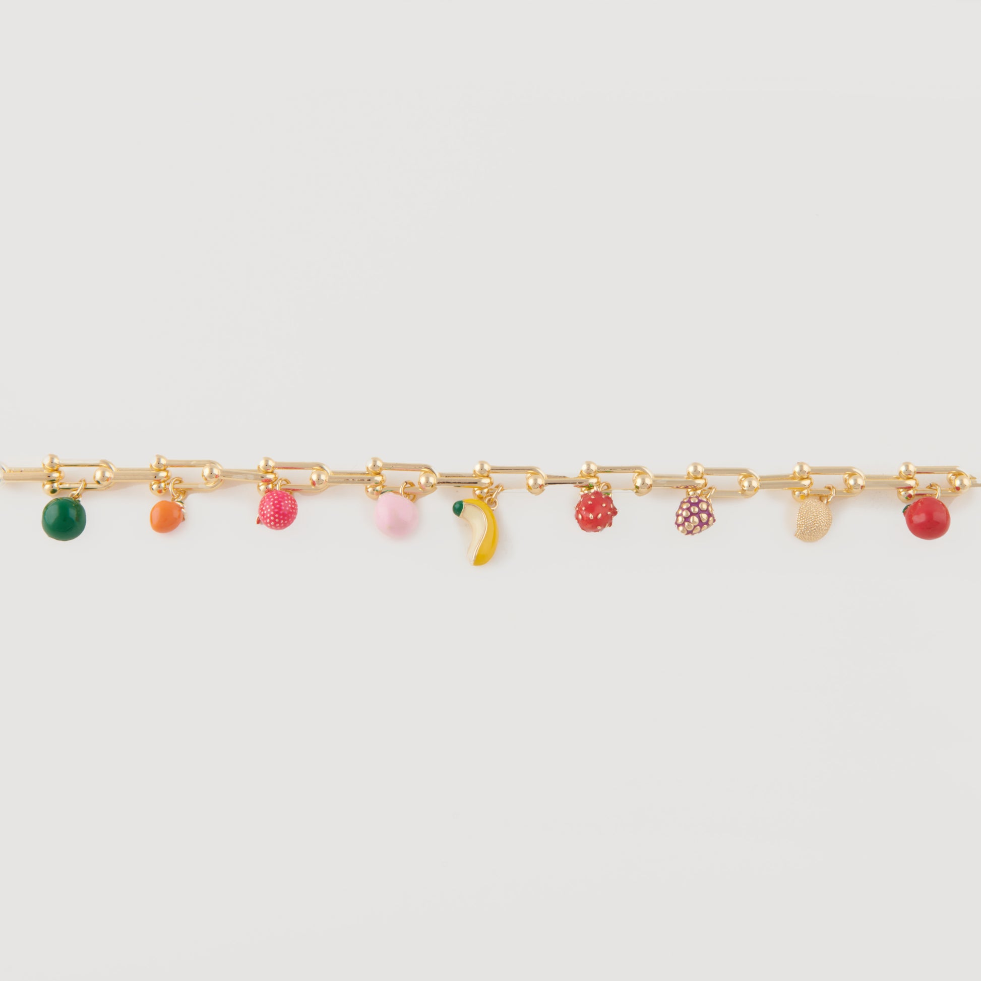 Entdecke eine sehr besondere vergoldete Kette, die mit ihrer farbenfroher und lebendigen Ausstrahlung begeistert. An unsere Fruit Plate Kette hängen sorgfältig gestaltete Frucht-Charms in strahlenden Farben – von saftigen Erdbeeren über leuchtende Zitronen bis hin zu fruchtigen Beeren. Jeder Charm verleiht deinem Look einen frischen, sommerlichen Touch voller Lebensfreude. Die harmonische Verbindung aus warmem Gold und bunten Früchten macht dieses Schmuckstück zu einem verspielten und zugleich eleganten Highlight, das jedes Outfit aufwertet. Darf auf keinem Trip deines Europe Summer fehlen!