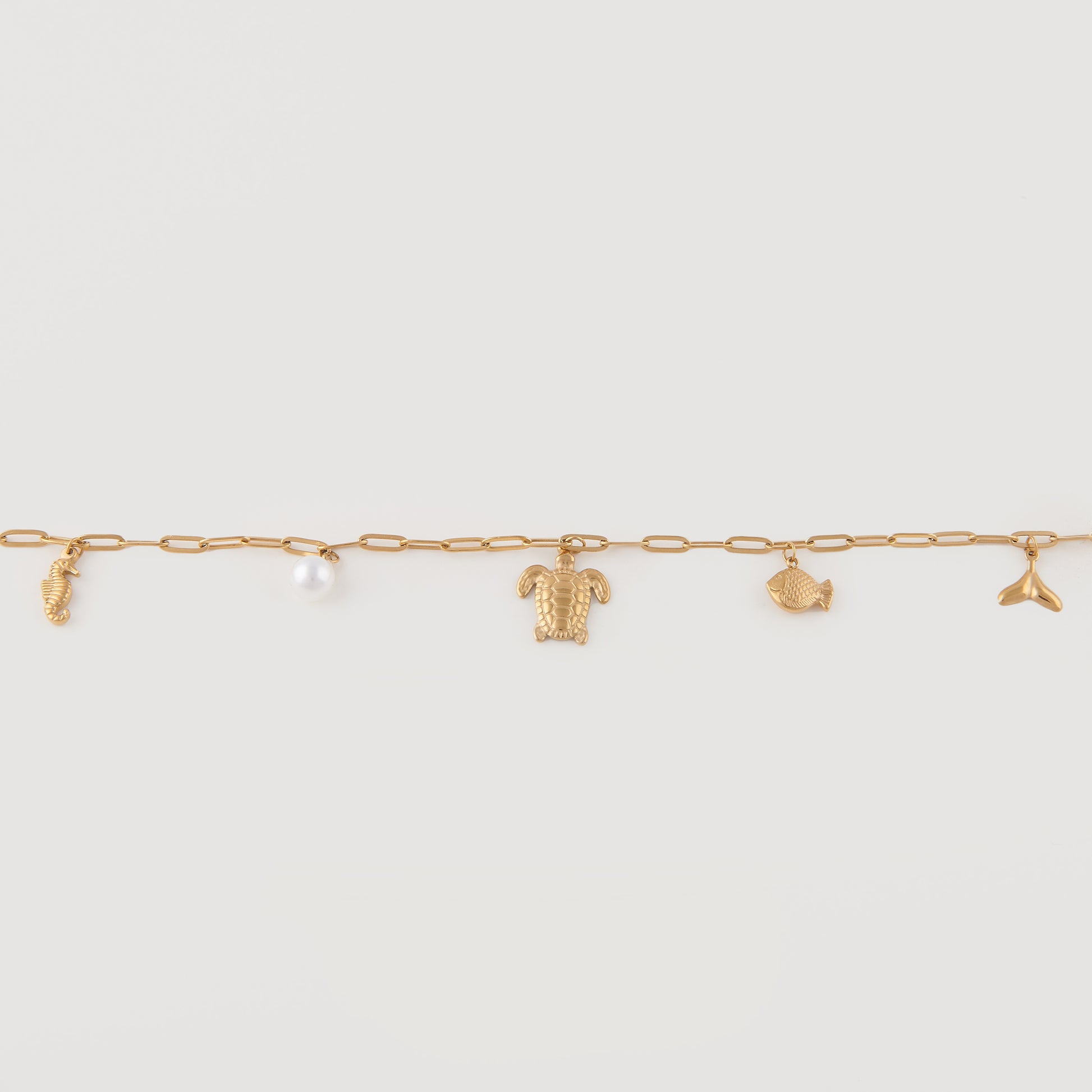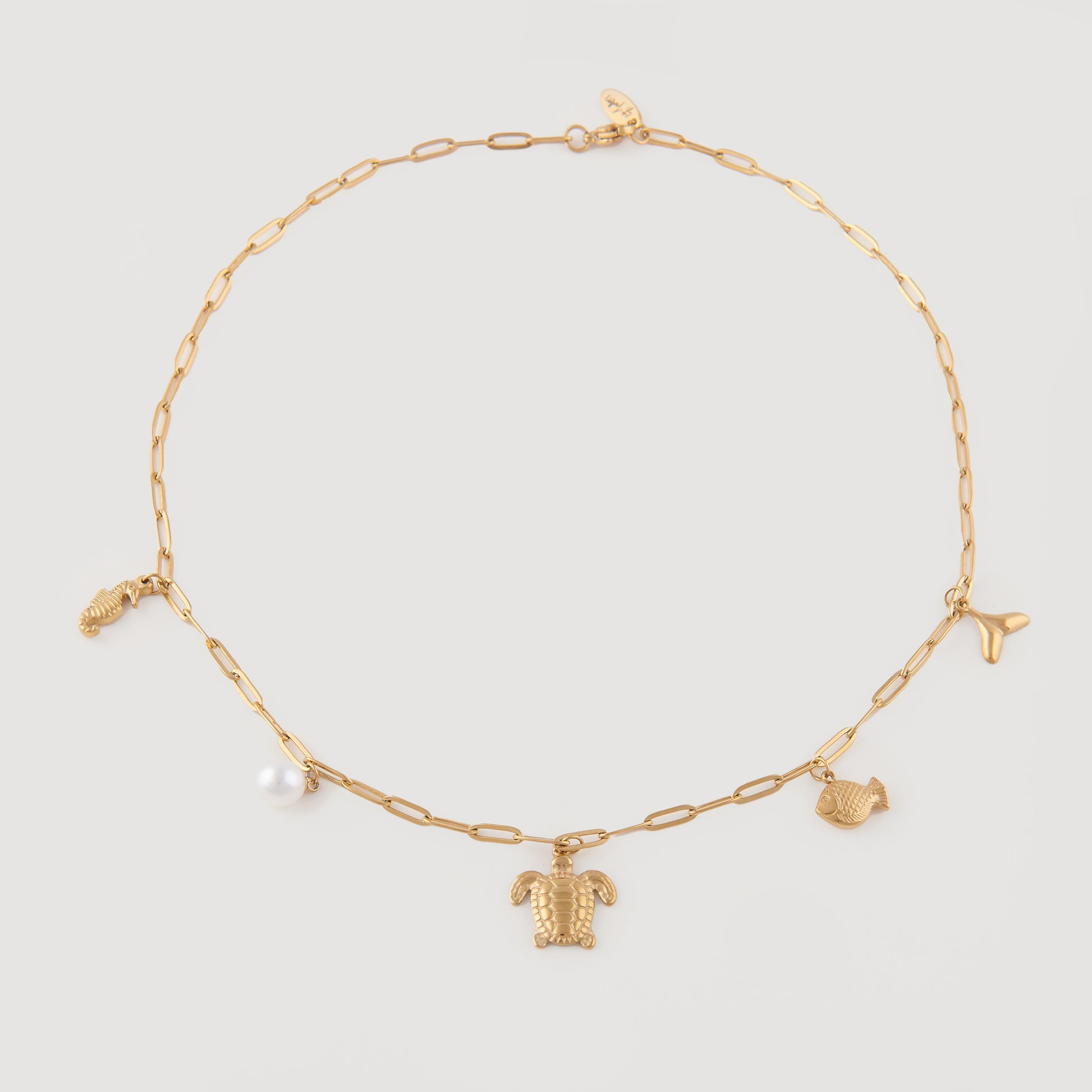 Diese elegante, vergoldete Kette ist ein echtes Schmuckstück für alle, die das Meer und seine faszinierenden Kreaturen lieben. Der hochwertige Anhänger zeigt eine liebevoll gestaltete Schildkröte, umgeben von weiteren charmanten Meerestieren, die das maritime Thema perfekt unterstreichen. Das edle Gold verleiht der Kette einen warmen, luxuriösen Glanz und macht sie zu einem stilvollen Accessoire, besonders in Kombination mit unserer Aquarius Necklace.